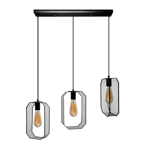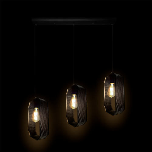 Подвесной светильник в стиле лофт с плафоном, выполненным из полосы пластичного металла, сформированной в вытянутый восьмигранник. Исполнен в конфигурации три плафона чёрного цвета, расположенных в линию на прямоугольном основании.