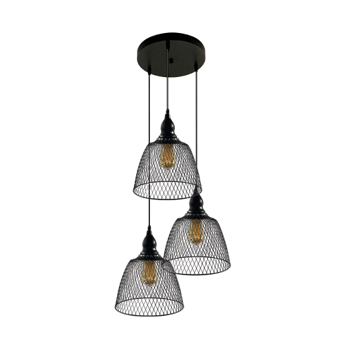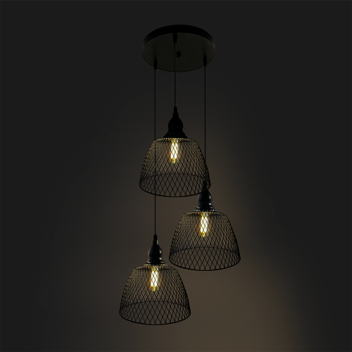 Изящный плетёный подвесной светильник барокко, выполненный из пластичного металла. Сочетание лаконичной арматуры и лёгкого плафона с вычурным основанием и фигурным навершием отлично подойдёт для помещений в стиле нео-лофт. Исполнен в конфигурации три плафона чёрного цвета на большом круге.