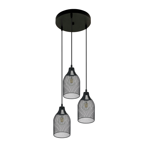 Сетчатые подвесные светильники с лёгкими продолговатыми плафонами бутылочной формы, выполненными из пластичного металла. Прекрасный вариант для создания барной атмосферы у себя дома, либо дополнения к оформлению помещения в стиле лофт. Исполнен в конфигурации три плафона чёрного цвета на большом круге.