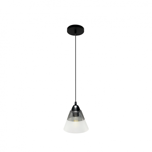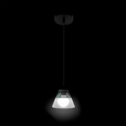 Стильный подвесной светильник с плафонами в форме усечённых конусов, выполненных из толстого прозрачного окрашенного стекла. Исполнен в конфигурации один плафон белого матового цвета на малом круге.