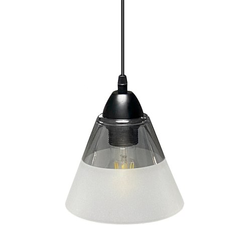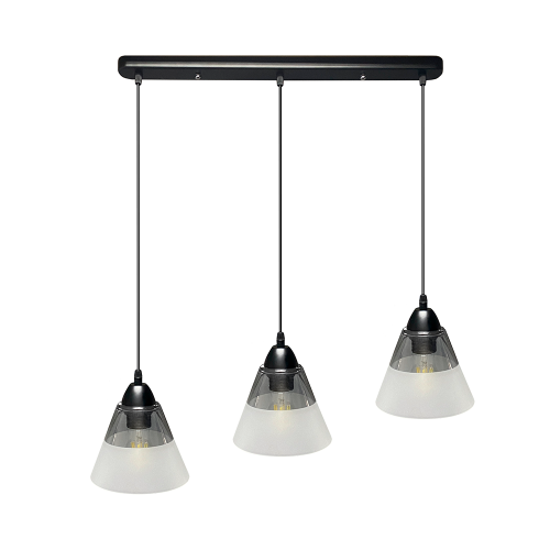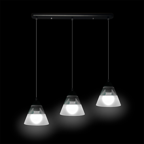 Стильный подвесной светильник с плафонами в форме усечённых конусов, выполненных из толстого прозрачного окрашенного стекла. Исполнен в конфигурации три плафона полупрозрачного белого матового цвета, расположенных в линию на прямоугольном основании.